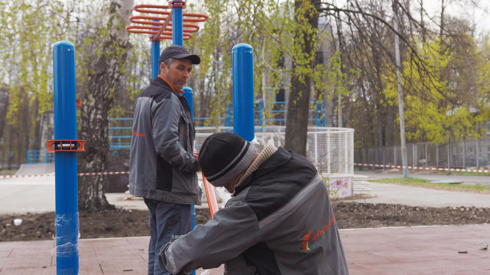 Спустя необходимое для застывания бетона время (зависит от погодных условий и марки бетона и может варьироваться от 1 до нескольких суток) монтируем тренажёры на закладные и визуально проверяем как «схватились» забетонированные опорные столбы.6 этап. Укладка плитки.
